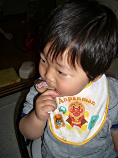 食べたら次はアンパンマン見せろってDVDのリモコン持ってきて催促。